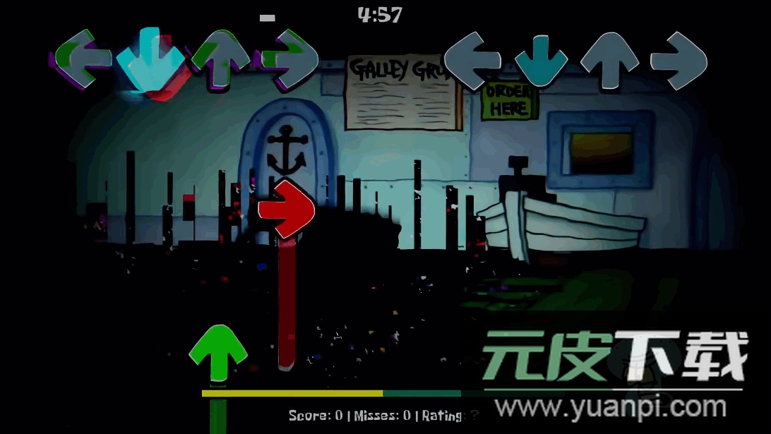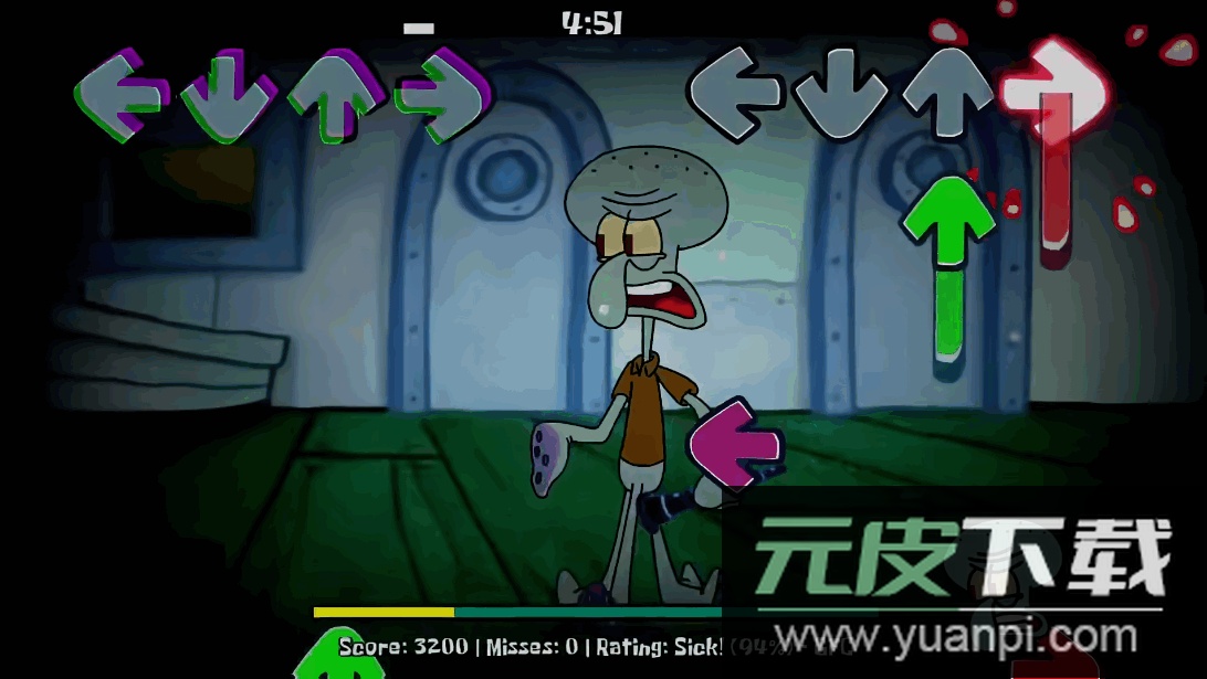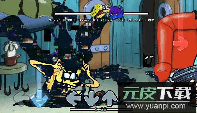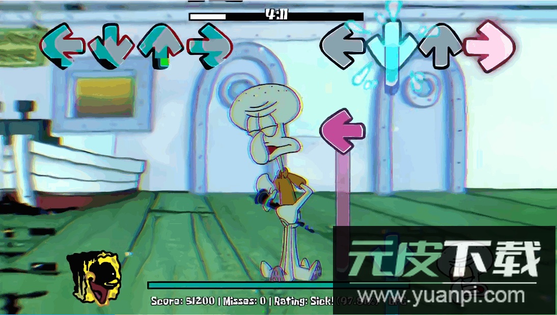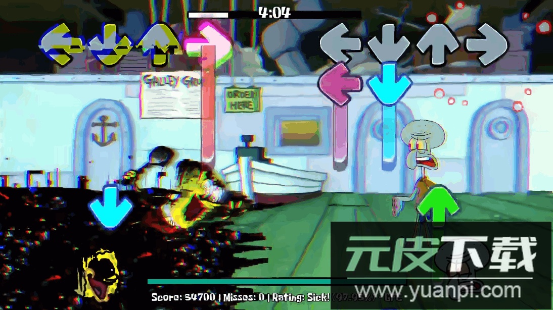 在周五夜放克的魔改模组中,比奇堡的居民陷入了异常状态。玩家将面对错误化的海绵宝宝与派大星,需要通过节奏对决帮助他们恢复原样。章鱼哥与蟹老板也作为可操作角色登场,游戏背景音乐采用改编版的降落在甲板上,为这场海底冒险增添紧张气氛。