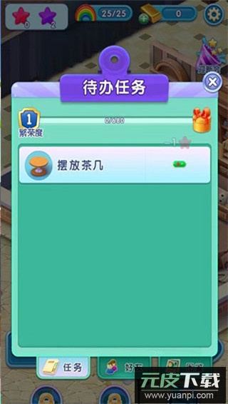 2、接下来开始修复奶茶店,首先摆放一些新的茶几;点击任务栏,开启集市重建任务,摆放茶几需要消耗1颗红星;