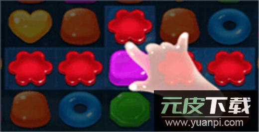 2、十字消除:交换相邻两个糖果,使五个同色糖果形成T型、L型或十字型,会在交换点生成特殊效果;再次消除该效果糖果,将同时消除一整行和一整列。