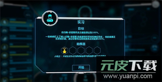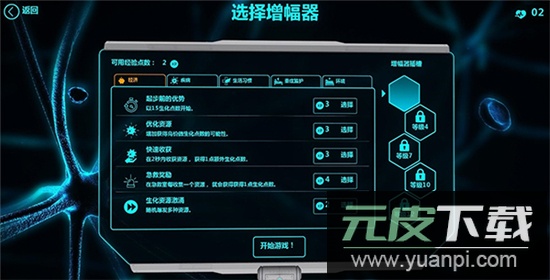 开始关卡前可选择增幅器,获得特定开局增益;等级越高,可携带的增益数量与种类越多。此处为2级,选择携带“随机生活方式”,使病人开局拥有两个良好生活习惯,有助于健康值恢复。