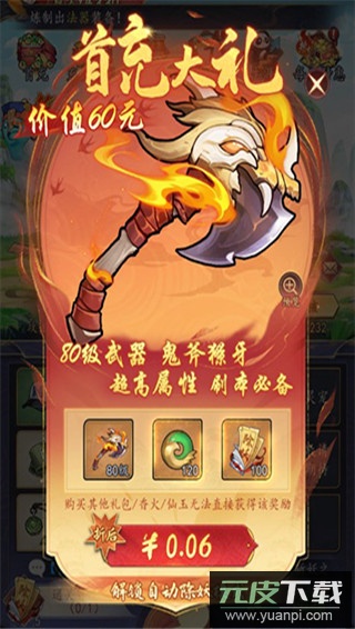 点击游戏上方的首充入口,即可进入对应页面;仅需零点零六元即可获得首充大礼包,内含八十级武器等珍贵装备道具。