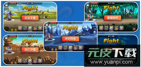 游戏包含豆豆平原、黑暗密林、冰封高地、死亡沙漠以及暗月山脉五种特色场景,共计15个充满挑战的分区地图。