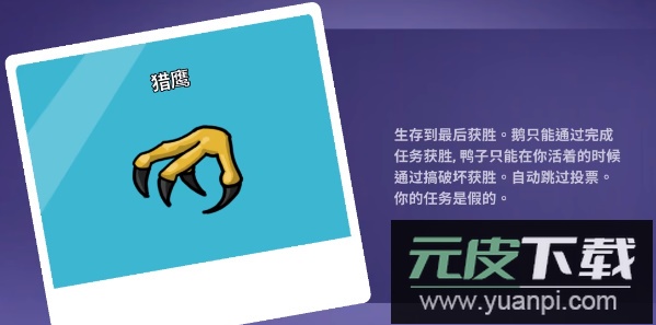 3. 猎鹰:存活至最后即可获胜;鹅只能借完成任务取胜,鸭子则需在你存活时通过破坏获胜;可跳过投票环节;你的任务是虚假的。