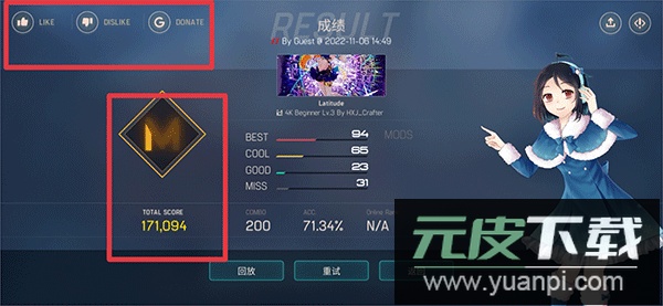 6、曲目结束后会显示本次评分,玩家可为该音乐点赞。