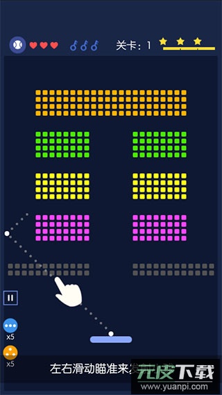 击碎横向排列的特定砖块组合,有时会获得额外三个小球,帮助玩家更高效地清除砖块。