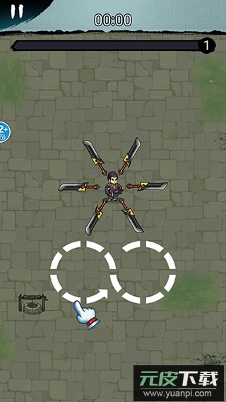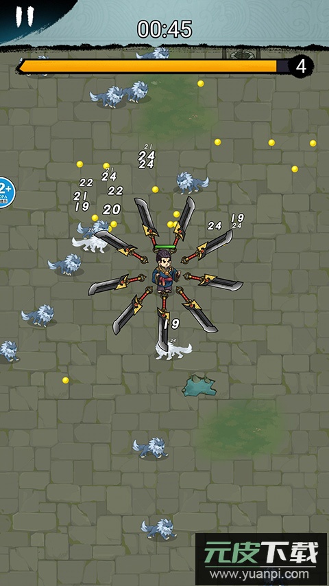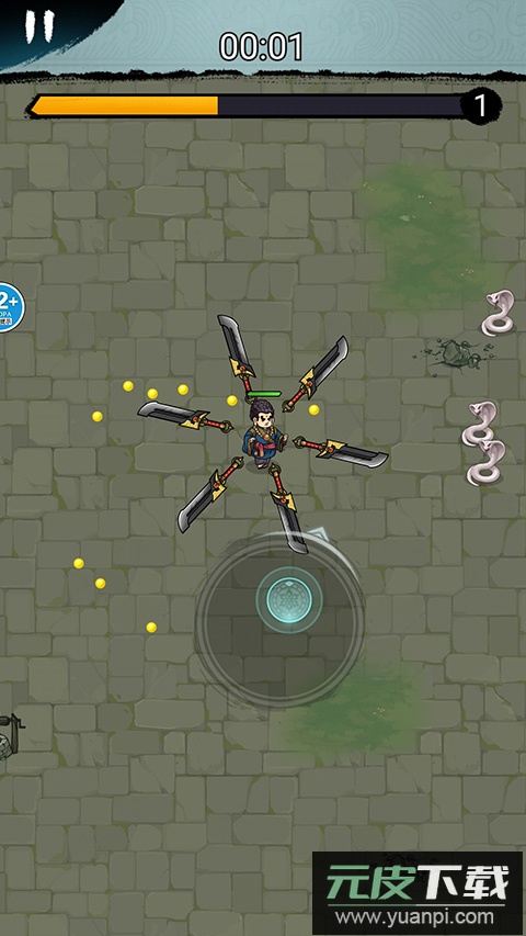 2、通过滑动屏幕控制侠客移动,角色周围的飞刀会自动旋转攻击附近敌人;