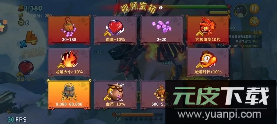 视频宝箱可提供多种增益效果:生命值提升、体型增大、龙焰持续时间延长、龙焰范围扩大、金币获取增加、分数加成提升。但请注意,视频宝箱所提供的增益效果仅在当前对局内有效。不过,若玩家在同一天的其他对局中再次获得相同增益,该增益效果会自动升级,最高可提升至四级。想知道驾驭拥有顶级增益的飞龙是何等体验?那就立刻进入游戏,寻找视频宝箱吧!