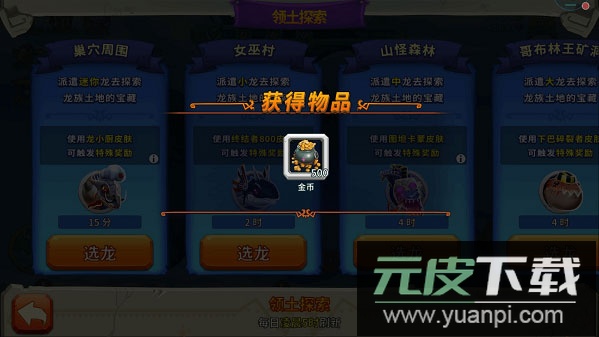 4、探索结束后,界面左下角将出现领奖提示,点击即可领取奖励。奖励内容包含:金币500至10000、宝石2至25、福利龙蛋、高级龙蛋等;