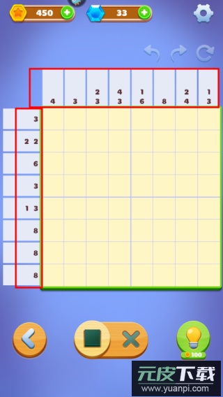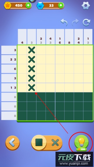 2、点击下方小灯泡图标,每完成一行或一列的涂色,该行或列会被标记为已完成,方便后续操作;
