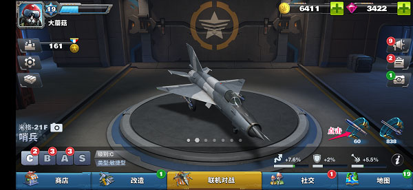 空战争锋是一款支持Android与iOS平台全球联机对战的3D飞行射击手游;游戏以真实战机为原型,收录超过100款可操控机型,包括美系F-22、英国台风等经典战机;战机按性能分为敏捷型、均衡型、防御型与攻击型四类,并按级别划分为C、B、A、S四个等级;游戏采用Unity引擎开发,拥有晴雨动态天气系统,通过精确的大气散射与光照效果营造逼真空中场景;玩家可飞越海岛、海港、城市与沙漠等多种地形,体验高度写实的军事空战;根据任务需求与个人偏好,可选择侦察机、攻击机等不同类型战机,并通过科技系统提升战机属性,例如敏捷、速度与装甲等;游戏提供重力感应与虚拟摇杆两种操作模式,支持360度特技飞行,玩家可自定义按键位置,选择最适合自己的操控方案。