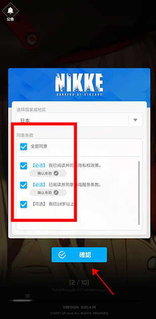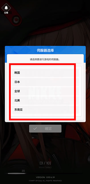 安装游戏后首先选择国家地区,服务器选项位于后方;勾选全部同意条款,点击确认进入下一步。