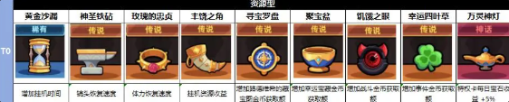 资源型藏品 这类游戏资源是提升实力的核心,能带来资源增益的藏品可以放在第一优先级升星; 核心优先选带有恢复速度、资源收益、金币获取加成的藏品; 不得不吐槽一下,属于神话品级的万灵神灯,特权卡每日宝石收益+5% 这个功能增益太低,即使升到5星 预计收益+10%,每日双卡都开的情况下多10个钻石,一个月才300个钻石,收益完全匹配不上神话品级; 希望官方能优化下,例如:1星调整为10%,5星50%的增幅(每升1星增加10%)