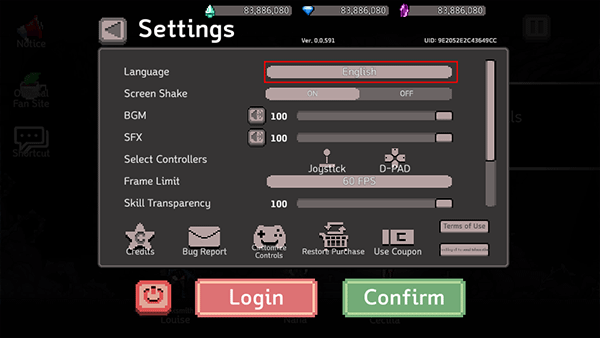 1、游戏初始界面为英文,需点击上方设置按钮;
