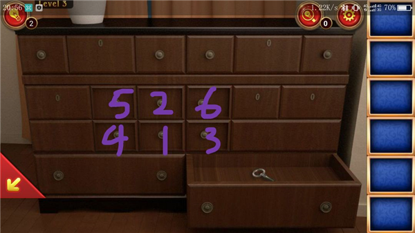 点击位置⑥,将把手与胶水组合,安装在标号为2的抽屉上;按照正确顺序点击按钮,打开右下角抽屉取得一把钥匙。