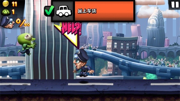 短按屏幕触发短跳,长按屏幕触发长跳。跑酷过程中遇到的交通工具,只要僵尸数量达标就可以直接撞开,撞开汽车需要4个僵尸,撞开公交车需要8个僵尸,撞开飞机需要16个僵尸,撞开坦克需要6到8个僵尸;跑酷过程中会随机出现幸存者,只要靠近幸存者,你的僵尸就会自动将其感染变成新的僵尸。每个僵尸都相当于一条命,僵尸数量越多,跑酷的操作难度也会越高,部分特殊场景还需要主动牺牲部分僵尸才能继续前进;