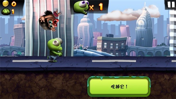 玩家不用控制僵尸的左右移动,只需要点击屏幕就能操控僵尸跳跃,短按屏幕是小幅跳跃,长按屏幕的话,僵尸会跳到一定高度后保持滑行姿态,在空中滑翔一段距离;