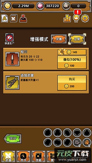 1、在此界面可以查看当前持有的武器详情,并执行强化操作或购入全新武器。