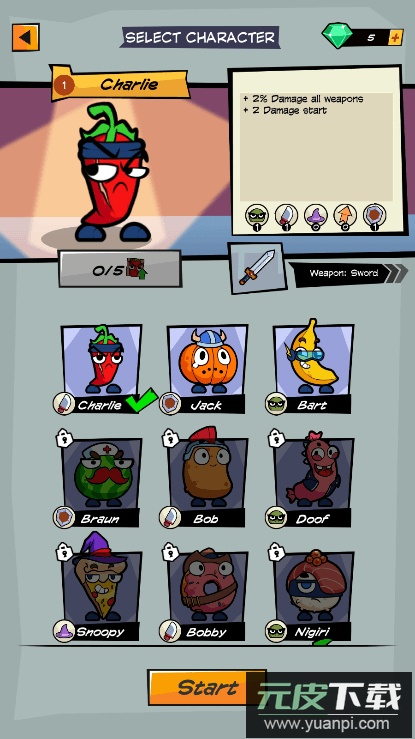 1、众多食物角色可供选择,需要消灭所有贪吃的怪物;