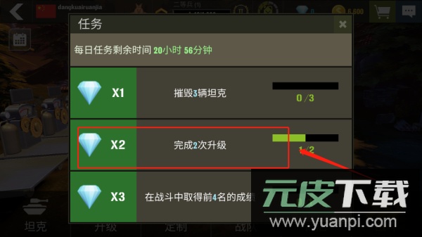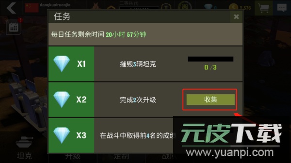 7、达成任务目标后即可领取奖励,例如钻石,这些资源可用于购买新坦克或强化现有坦克;
