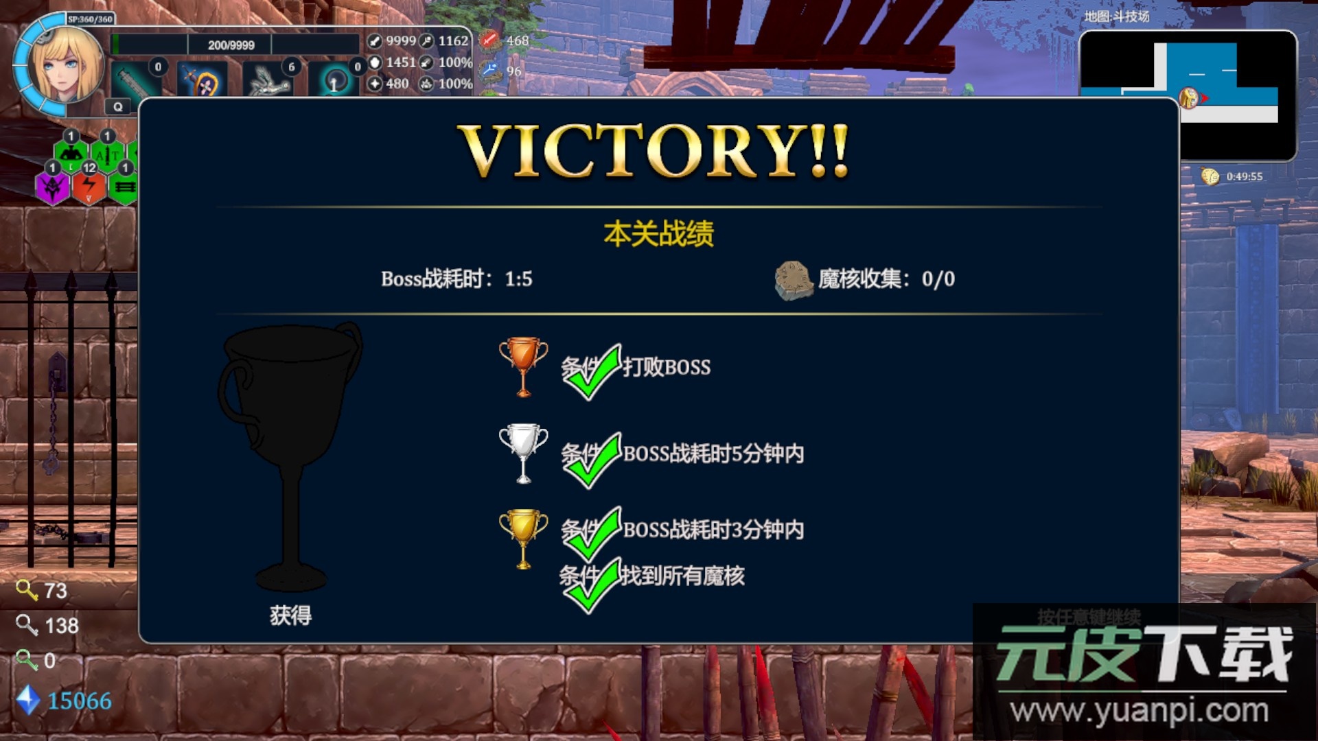 结算画面在59秒时因自动跳过未能截取,只得到1分05秒的截图。但这足以证明27周目能够完成一分钟内击败隐藏BOSS的成就。一周目建议使用剑盾组合,战斗会相对轻松。芯片根据个人需求选择,部分蓝色与绿色芯片在前期作用明显。副武器可携带黑球,即环绕角色的两个球体,另一副武器按喜好搭配。每关有5个魔核,五关共25个,应尽量收集。当你准备挑战高难度或隐藏BOSS时,需有意识地调整装备配置。多周目积累过程中逐步调整即可,不借助修改器则需反复刷取资源。魔核在27周目中基本全部拾取,偶尔为节省时间遗漏个别,影响不大。收集魔核主要为提升攻防属性,地图在不同周目会有细微变化,跑图过程较为繁琐,若个别魔核寻找过于困难可直接放弃。以下是击败隐藏BOSS时的装备与芯片状态:
