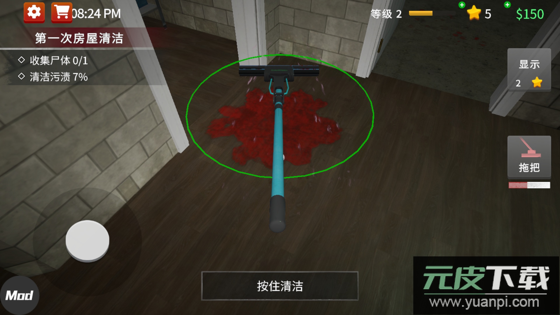 6、选中拖把后,长按血渍区域即可开始清洁,直至痕迹完全消失;