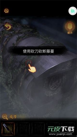 6、重新来到棺材前,选中砍刀后点击棺材,即可斩断藤蔓并打开棺盖。