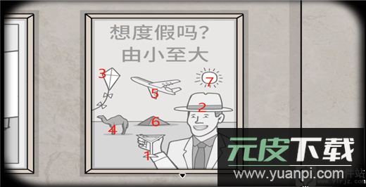 左侧画报依次点击:嘴、眼、手镯、头发、眼、嘴、箱子,得到号码53114;右侧画报点击顺序为:杯子、帽子、风筝、骆驼、飞机、金字塔、太阳;撕开画报左上角取得钥匙。