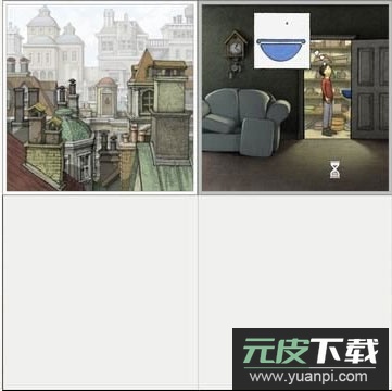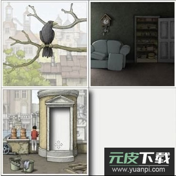 4、男孩拿着水盆离开储藏室,来到屋顶;此时将第一格移至第三格,并点击第一格画面中的乌鸦。