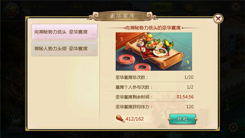 宴客厅中,成员可开启宴席为同僚提供体力;普通宴席提供60点体力,豪华宴席提供120点,每日参与宴席是获取体力的重要途径。