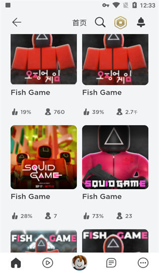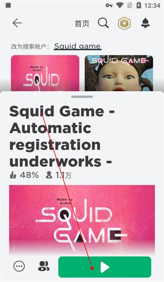 Squid game入口:搜索“Squid game”,在返回结果中找到点赞率48%左右、参与人数1.1万的房间进入即可。