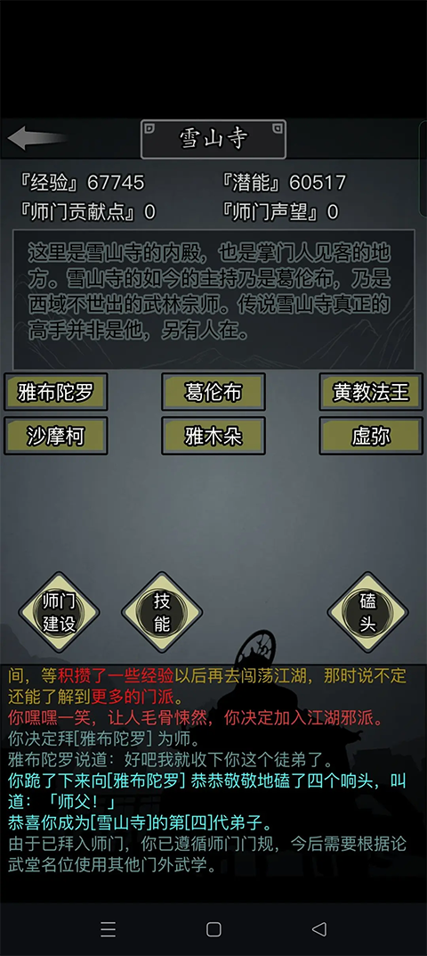 成功拜师后,点击师门即可进入门派主界面;通常界面内有五人,前三位是可拜师的师父,第四位是讲述门派渊源的前辈,第五位则是出售门派残页的弟子;部分门派结构特殊,师父数量较多。