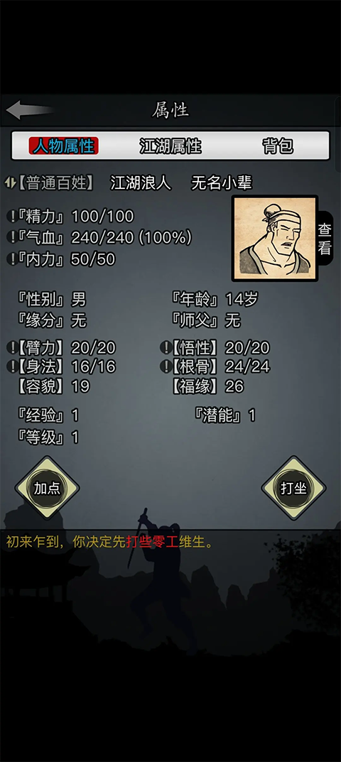 进入主界面后不必急于拜师,先点击头像即可查看个人属性。
