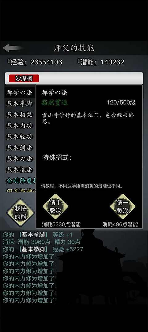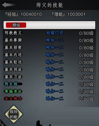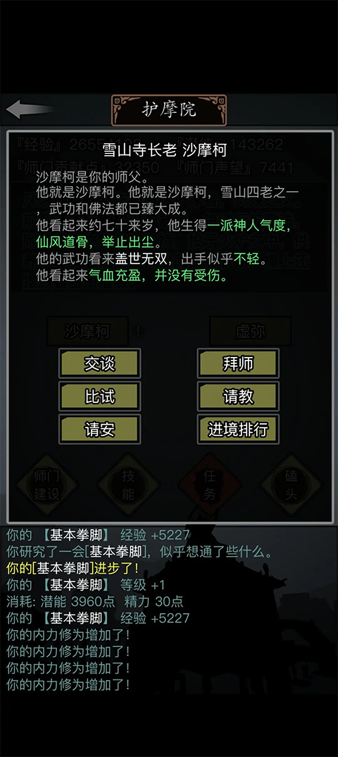 点击师父进行请安,可获得500贡献点,若持有月卡则可额外获取2000点;点击请教即可学习武学技能。