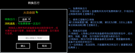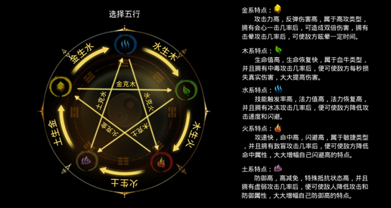 游戏提供金、木、水、火、土五种五行。玩家可根据各系特点选择。若在50级前对当前五行不满,可免费转换一次;后续转换需消耗昂贵的涅丹,请谨慎选择。