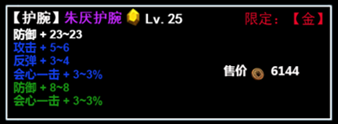 对金系玩家而言,通常可用至40或45级。紫色品级提供+6%会心一击,对前期升级帮助很大。该装备仅25级,材料相对易得,即使使用天籁石升级也只需最低级,成本较低。淘汰后放入图鉴也可增加属性。