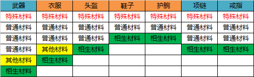 方式二还有一种情况需注意,即上图右一所示:若相生材料与普通材料不同类,以武器为例,若特殊材料与相生材料同类,则特殊材料计入主材,此时有4个主材,可再放2个相生材料;若特殊材料与普通材料不同类,则特殊材料不计入主材,需另加四个主材,此时只能放一个相生材料。