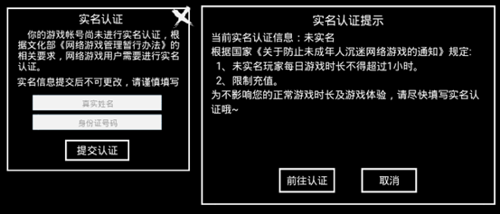 进入游戏后需完成实名认证。未认证或认证未通过的玩家将受限制,包括每日仅可登录1小时、凌晨无法登录以及充值限制。