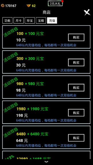 从商店直接购买元宝,648元以内各充值档位均有首次双倍机会。【每个账号永久仅限一次,后续活动可能有变动。】
