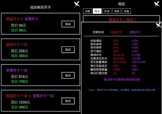 月卡:可提升升级效率、材料掉率、副本次数等,组合购买更划算。