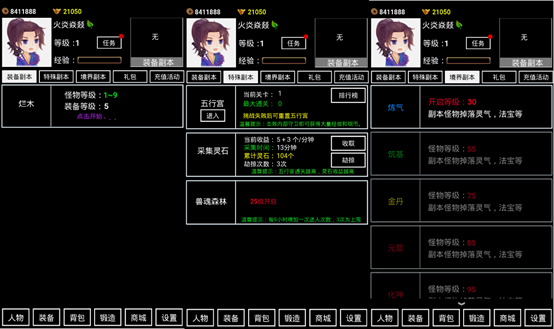 游戏主界面由几大模块构成:装备副本、特殊副本、境界副本。
