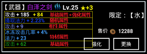 强化属性:颜色为黄色,由强化等级决定,是提升实力的关键。武器强化攻击、防具强化防御、项链强化生命、戒指强化法力,披风内甲则强化各系特有属性;强化数值计算该装备全部对应属性。