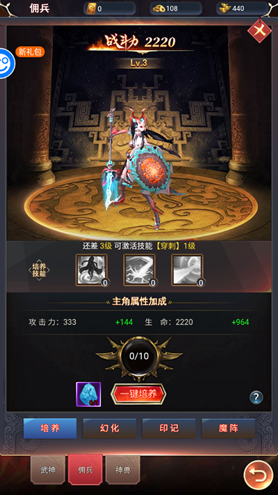 6、通关第二关并击败关卡boss即可解锁佣兵系统,角色达到指定等级还能陆续解锁武神、神兽等功能;