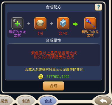 获得生锈水龙装备后,可在制造界面合成为瑕疵水龙装备,合成成功率50%,失败材料消失。