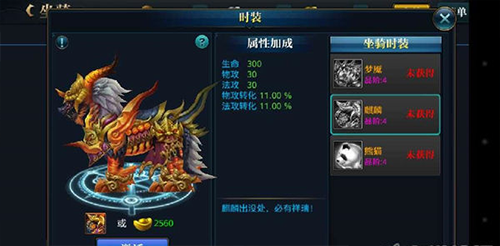 坐骑的实力提升依赖时装、技能与洗髓。第七天登录赠送梦魇时装,麒麟与熊猫时装则需购买获取。