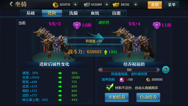 坐骑进阶能直接提升其属性与移动速度,进阶至三阶还可解锁马上战斗功能。进阶所需坐骑丹可通过商城购买或每日坐骑副本获得。