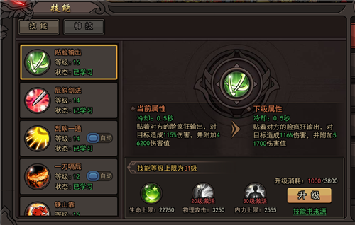 3、技能最高可提升至31级,每升满10级就能激活对应属性加成,提升生命上限、魔法攻击、内力上限三类属性。