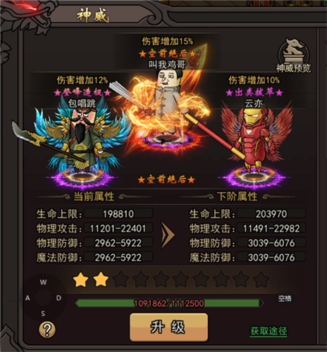 2、玩家完成对应指定任务就能获取神威值,消耗神威值可提升神威等级,获得高额属性加成;