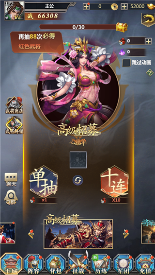 3、普通招募和高级招募属于随机招募,每日普通招募有3次免费次数;将军府属于定向招募,可固定获取某一国家的武将;玩家累计招募次数达到指定标准,还能领取招募宝箱奖励;