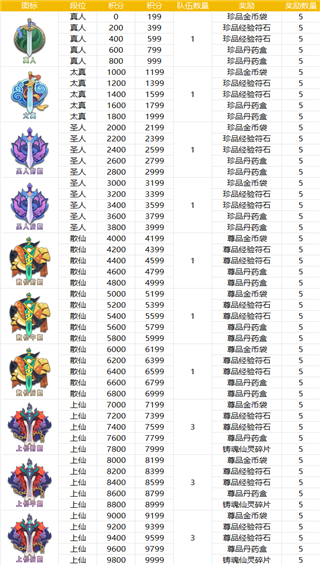 玩家可以点击左侧段位图标直接跳转到对应段位入口,每个段位对应的积分要求、匹配队伍数量、专属奖励如下图所示: