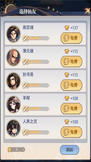 需要注意的是,每次展示的5个可挑战对手都能手动刷新重置,前10次刷新完全免费,第11次开始每次刷新需要消耗10灵玉,对手战力从上到下依次降低,战胜后获得的积分也有差异,玩家可以结合自身战力水平选择能打赢的对手,用有限的挑战次数拿到最多积分。